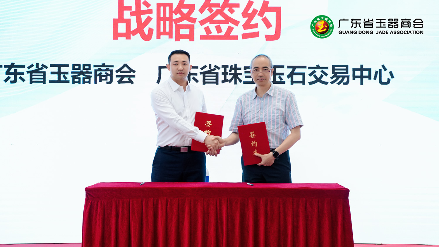 广东省玉器商会支部书记陈阳与广东省珠宝玉石交易中心董事长黎志伟签约